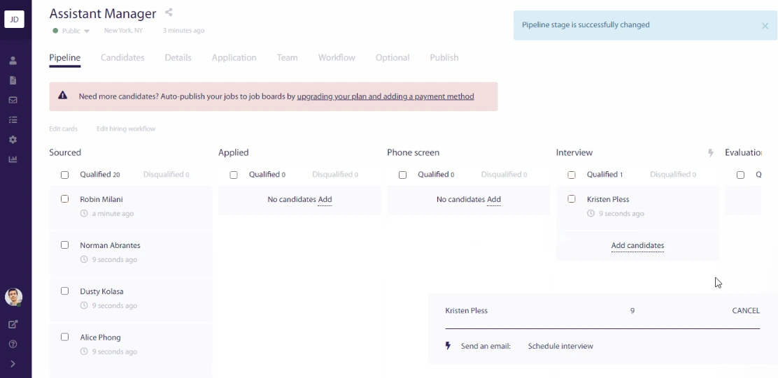 - Upgrade path: More sophisticated tools, such as job board integrations and interview scorecards require a paid plan.