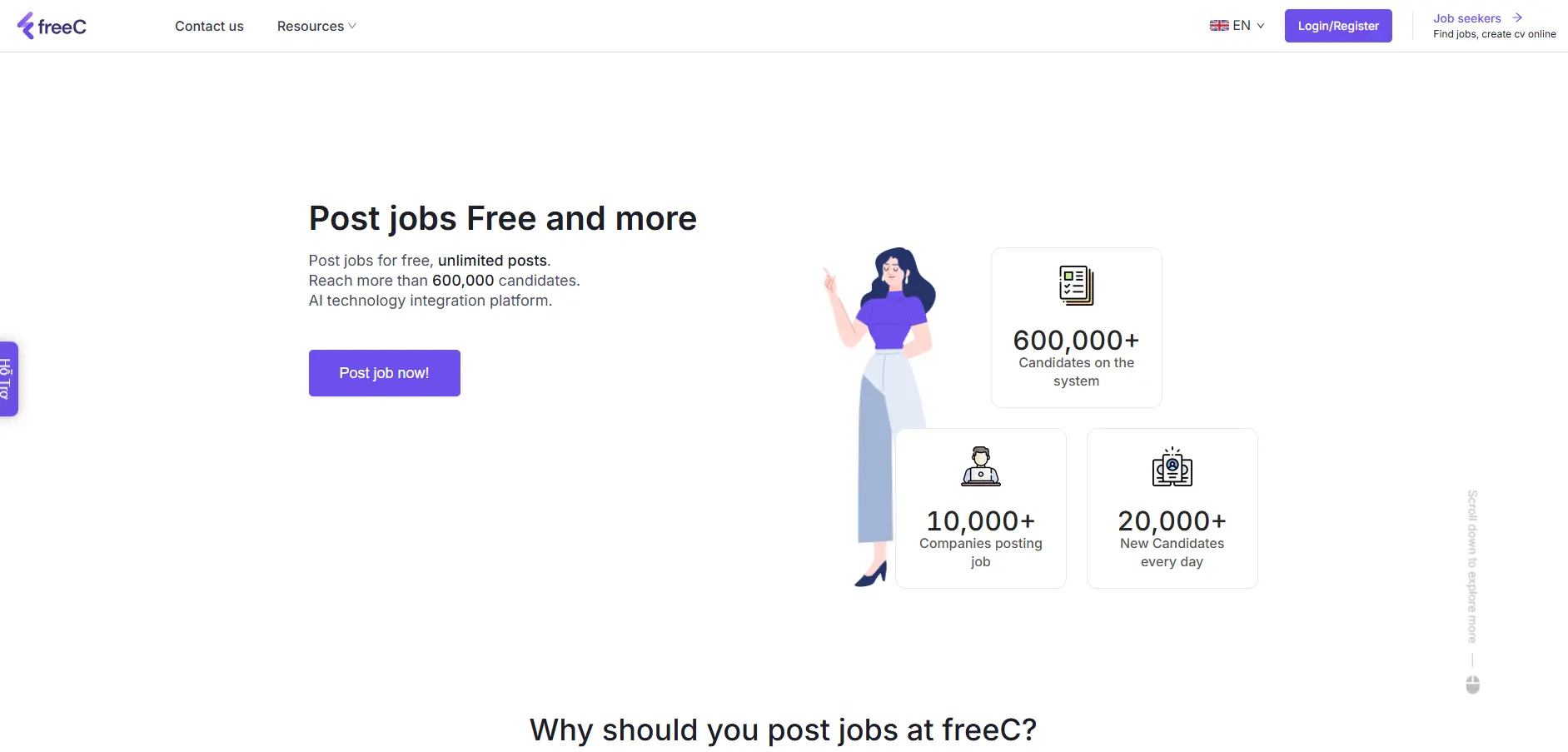 freeC is a Vietnam-based recruitment platform that permits unlimited free job postings and provides employers with applicant management tools. Independent reports cite about 20,000 monthly job seekers and a database of 400,000–550,000 profiles, with strong representation in IT and technical fields, and attracts both local and international recruiters seeking Vietnamese professionals.