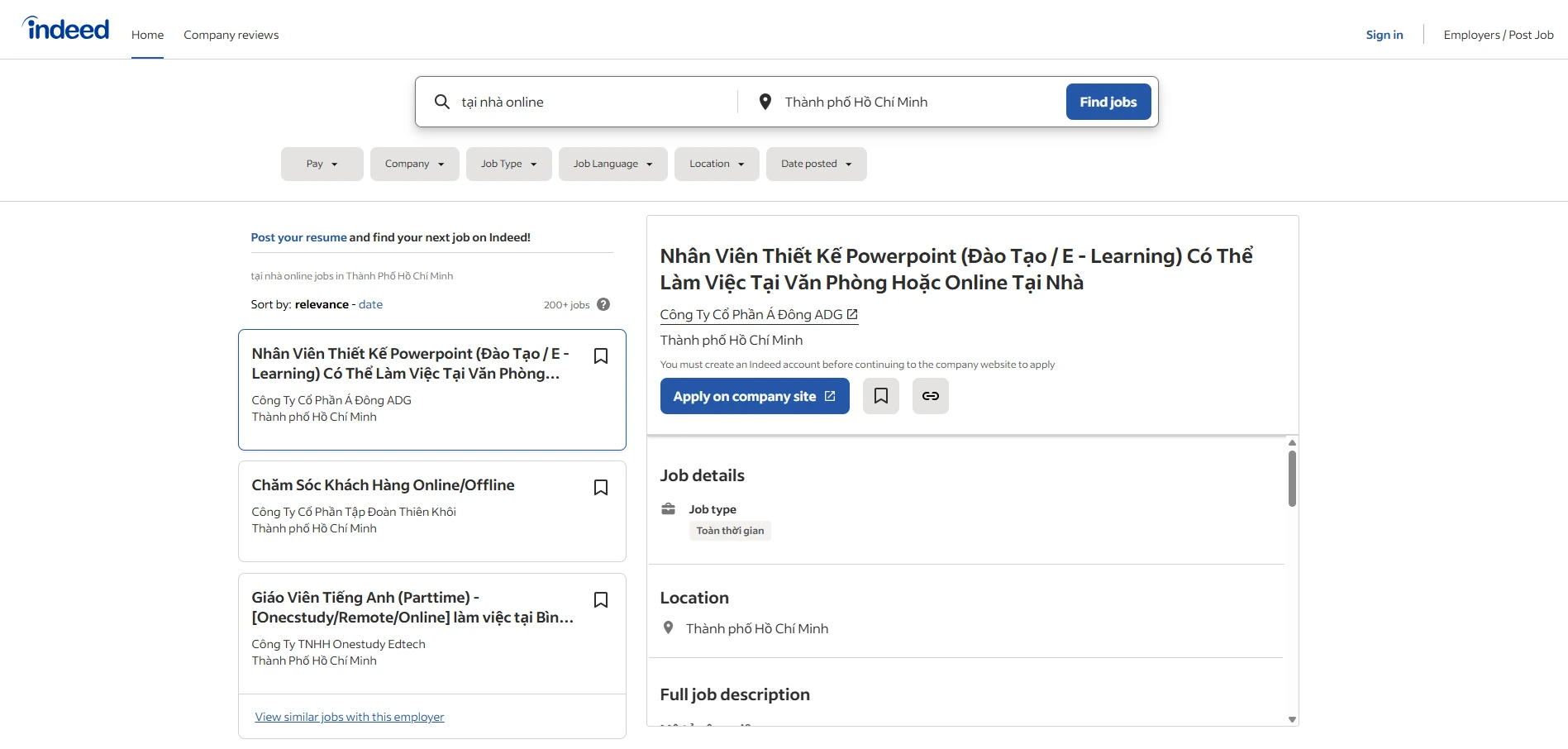 Indeed operates as a global job search engine and aggregator, indexing job listings from company career sites, job boards, and direct employer postings. In Vietnam, Indeed permits recruiters to post jobs at no cost (with an option to sponsor for greater prominence) to appear in general search results. It offers tools for application management, screening questions, and filtering of candidate submissions.