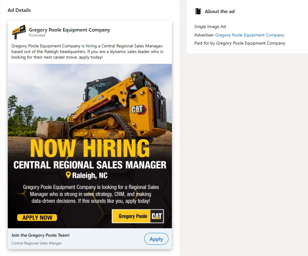 This ad by Gregory Poole Equipment Company markets an opening for a regional sales manager in Raleigh, NC, with an emphasis on qualifications such as CRM skills and data-driven decision-making. The layout is visually bold, featuring heavy machinery and large typography consistent with the company’s industrial brand. The messaging is direct and role-focused, using phrases like “dynamic sales leader” without overselling. However, details on benefits, compensation, or work culture are absent. The ad assumes the audience is already familiar with the company or its sector, which may narrow its effectiveness with broader talent.