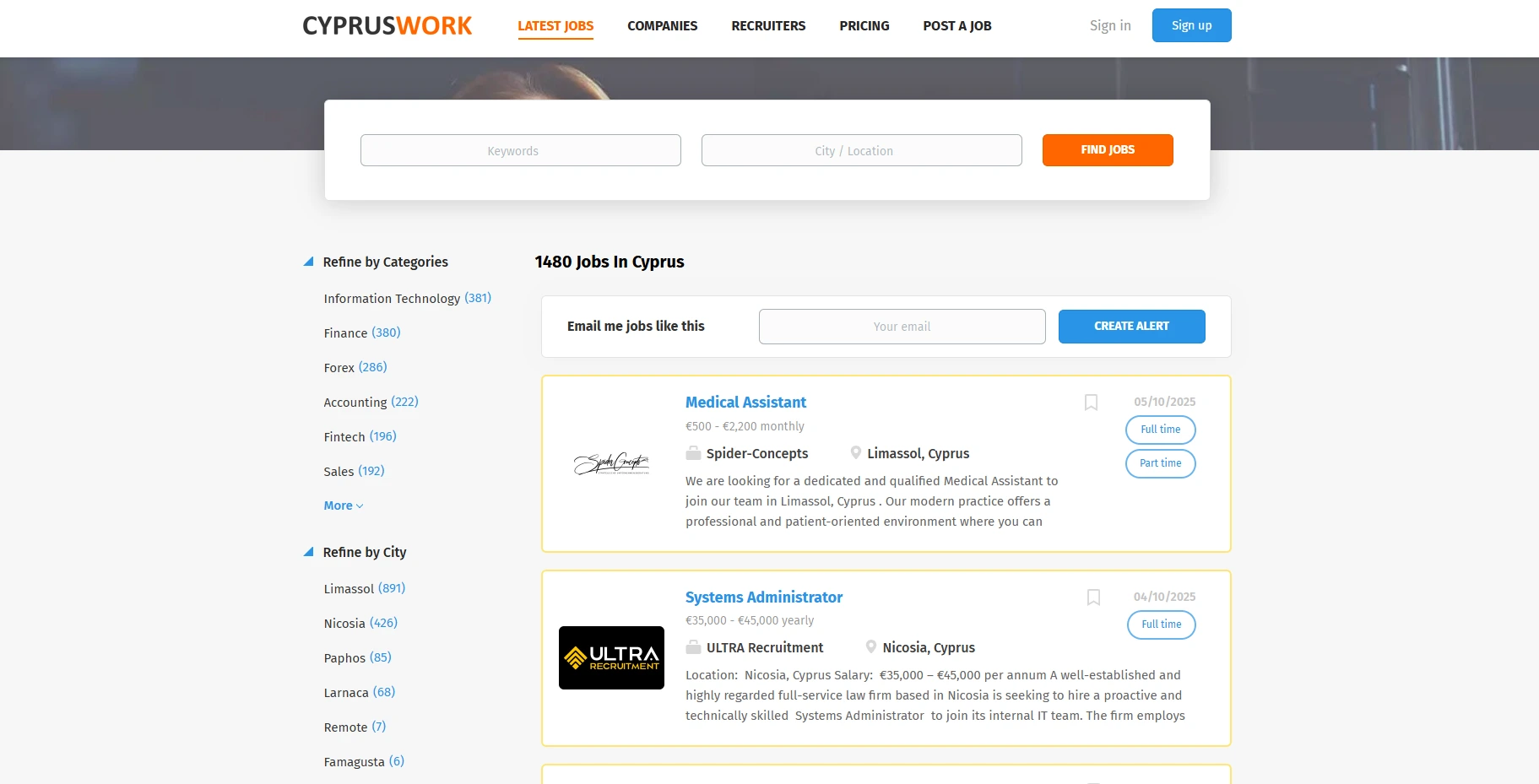 CyprusJobs.com is a long-established local job portal covering major Cypriot industries and cities. It provides cost-effective posting options and allows positions to remain visible for extended periods (up to 12 months). Job postings are free for up to 3 per year, with additional posts at €15 each.