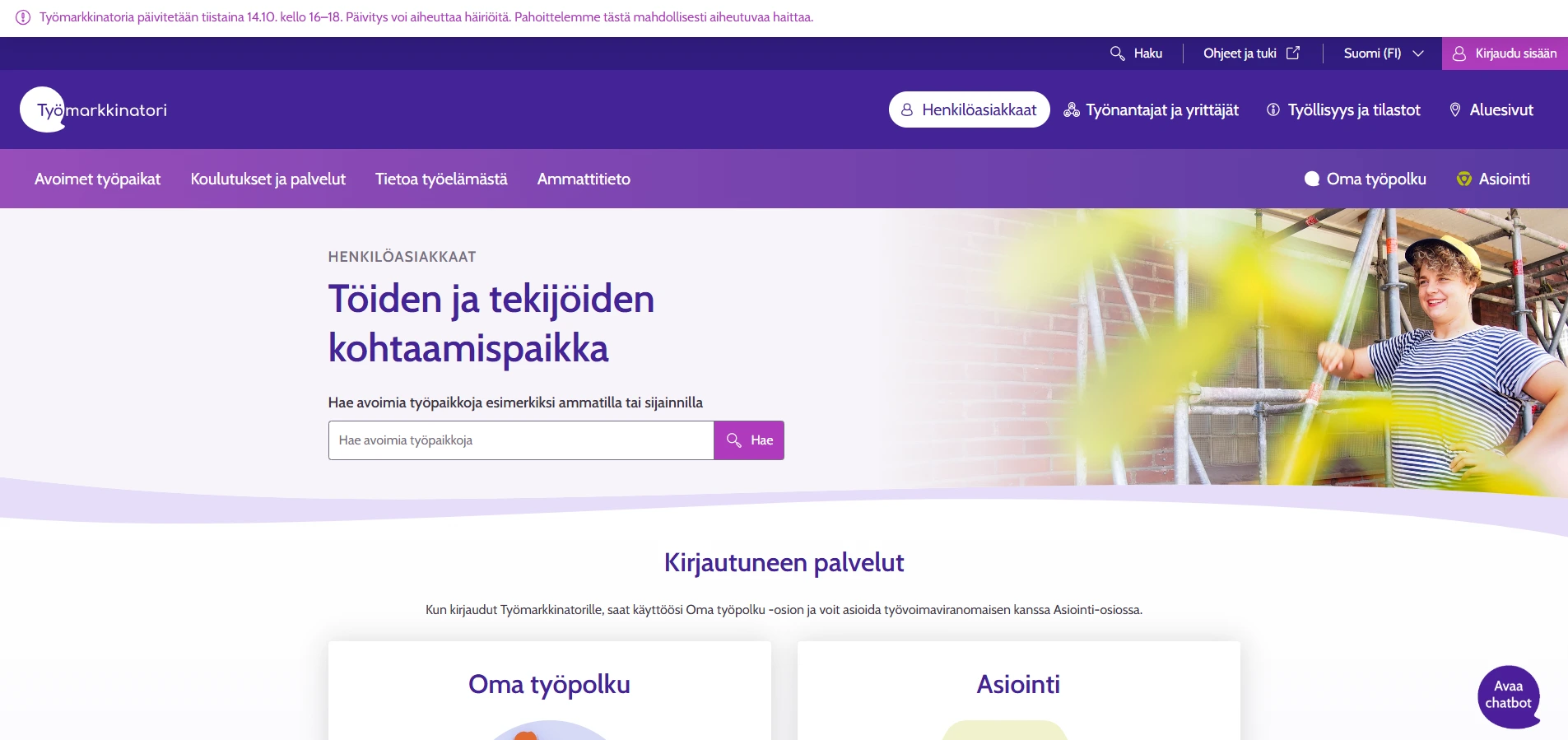 Job Market Finland (Työmarkkinatori) is the public employment service portal of the Finnish government, connecting employers with job seekers across sectors. It supports both general and subsidized job placements, and uses matching logic to suggest candidates. The interface is multilingual and integrated with regional TE offices.