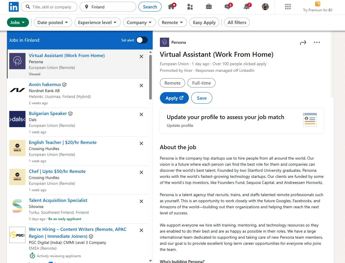 Indeed functions as a global job aggregator and direct job board, also serving Finland via its Finnish-language site (indeed.fi). It allows employers to post jobs and also aggregates listings from many other sites, expanding reach across both local and international audiences. Indeed is sector-agnostic and covers everything from entry-level to senior roles.