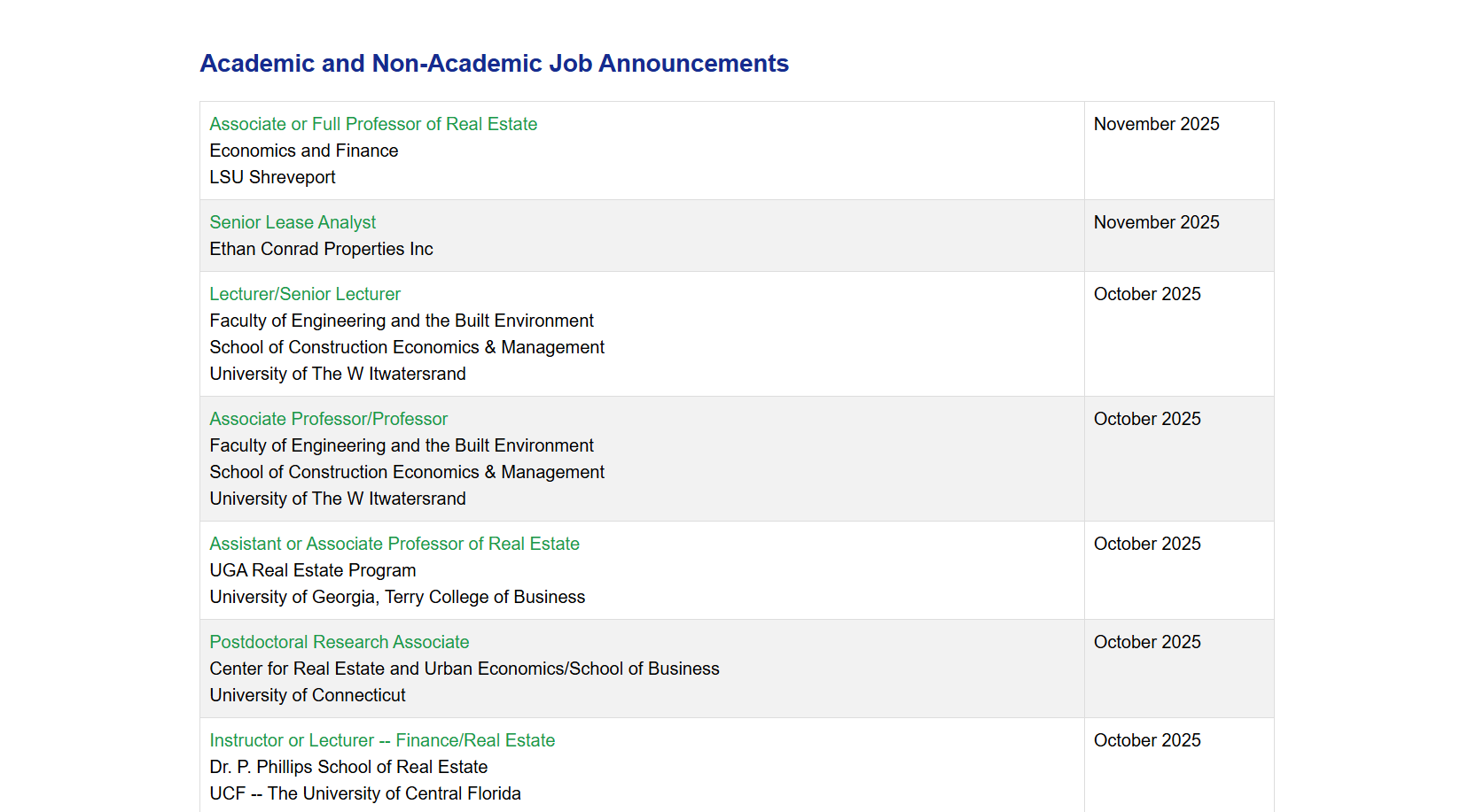 - Research community: Connects employers with professionals engaged in real estate research and education