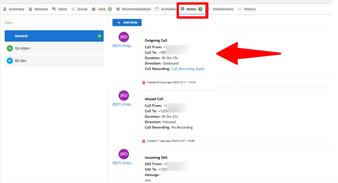 Integrations such as KrispCall let you place calls without leaving the ATS, while Manatal’s AI Interviewer takes it further by automating early-stage candidate screening. Calls, SMS messages, voicemails, and AI-led interview interactions are all stored in the candidate profile, giving your team full visibility into every touchpoint. This reduces manual tracking and keeps communication consistent, so you can move faster. In practice, that speed matters. Candidates often accept interviews or offers from the first company that engages them.