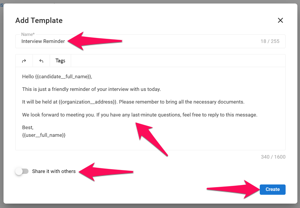 Mit Manatal können Sie SMS-Nachrichten direkt aus den Profilen der Kandidaten versenden. Mit anpassbaren Vorlagen können Sie schnelle Updates (wie Interviewbestätigungen) versenden, die höhere Öffnungsraten als E-Mails haben.