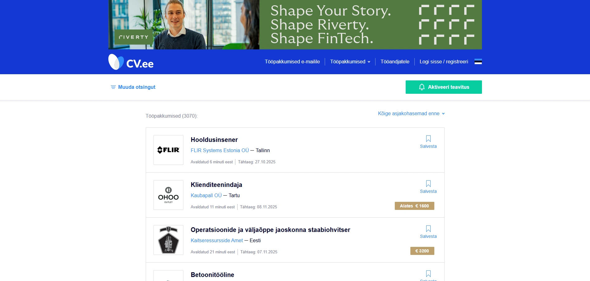 CV.ee es un portal de empleo báltico de larga tradición que distribuye ampliamente anuncios de empleo a través de medios asociados y canales sociales. Los empleadores tienen acceso a herramientas como la búsqueda de candidatos, el resaltado y las opciones de actualización de anuncios. La plataforma es multilingüe (estonio, inglés y ruso) y está respaldada por la red Monster Media.