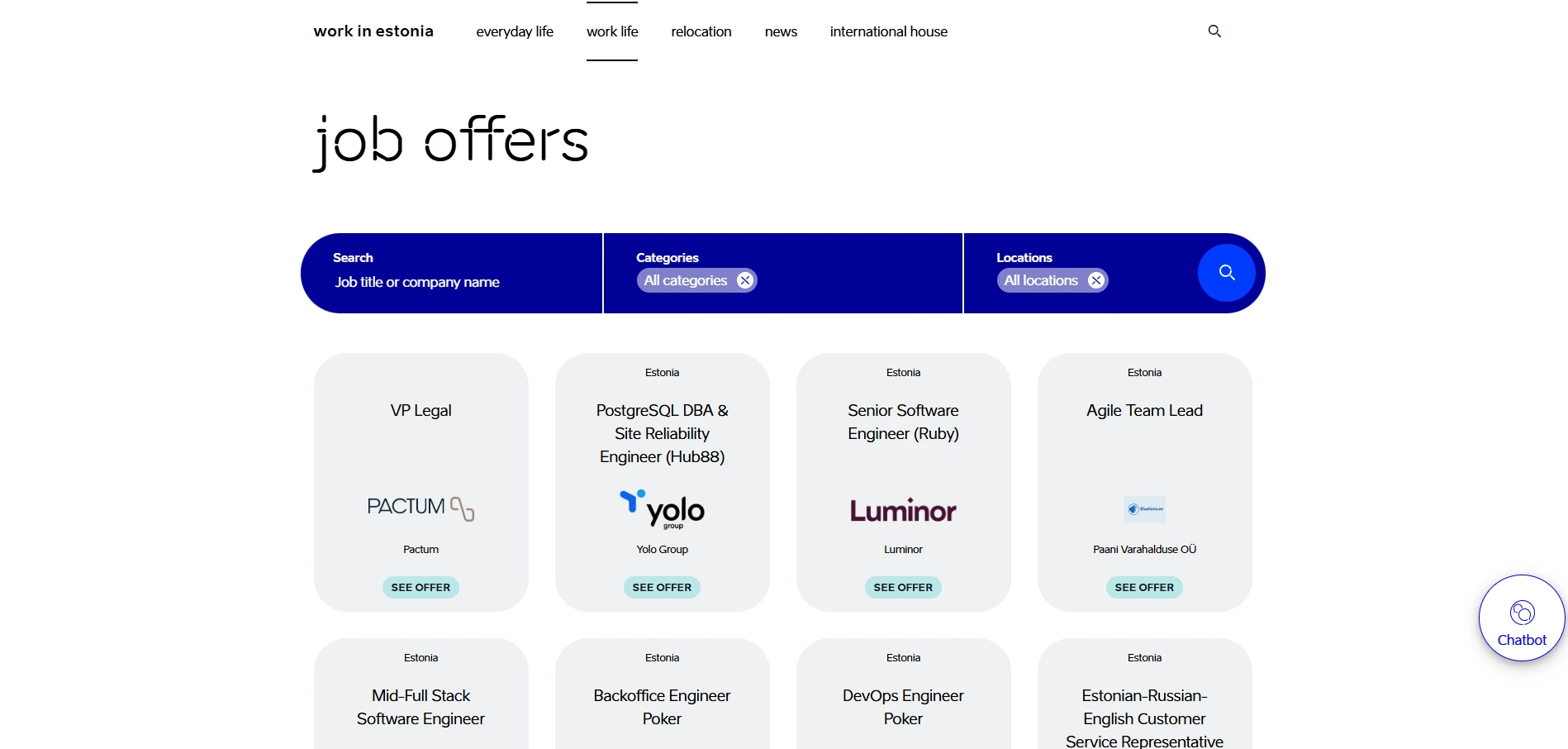 Work in Estonia agrega ofertas de empleo de los principales portales locales y las muestra en inglés para atraer a candidatos internacionales. Cualquier oferta publicada a través de plataformas asociadas se sindica automáticamente aquí sin coste adicional. Aunque su alcance al talento internacional es una ventaja, el control sobre la clasificación y la mejora de los anuncios es limitado.