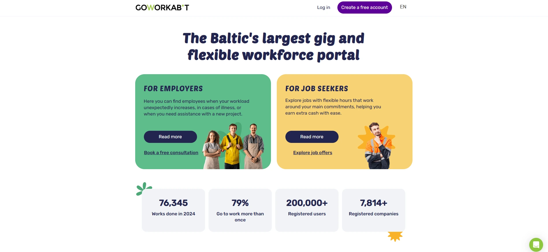 GoWorkaBit es una plataforma de trabajo flexible, a corto plazo, que pone en contacto a empresas con trabajadores disponibles por horas o por proyectos. Los empleadores publican "workbits" y reciben solicitudes de candidatos preseleccionados en tiempo real. Es útil para puestos de venta al por menor, eventos, logística o de temporada en los que se necesita personal rápidamente.
