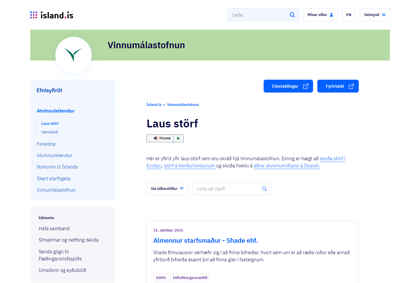 La Dirección de Trabajo(Vinnumálastofnun) es el servicio oficial de empleo del gobierno islandés, responsable de gestionar las prestaciones por desempleo, el pago de los permisos parentales y proporcionar información exhaustiva sobre el mercado laboral. Como organización de servicio público con nueve oficinas en toda Islandia, la VMST ofrece servicios gratuitos de contratación y constituye un recurso crucial tanto para empresarios como para demandantes de empleo. La plataforma apoya especialmente a los trabajadores inmigrantes y a los solicitantes de asilo con servicios de asesoramiento especializados, lo que la convierte en un canal de contratación esencial para las empresas que buscan diversas fuentes de talento.