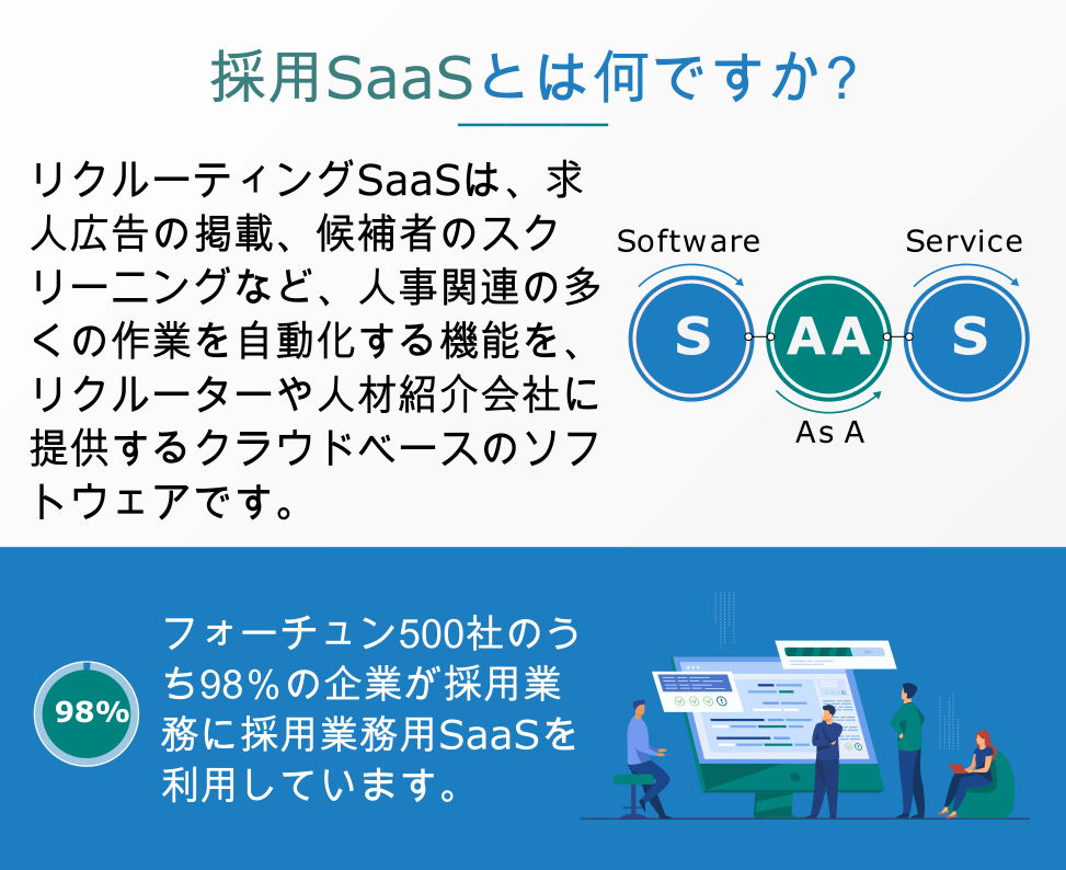 SaaSとはどういう意味でしょうか? 基本的には、クラウドに常駐する非常に効果的なオンデマンドソフトウェアテクノロジーです。人事担当者と採用代理店が信頼するようになった、非常に便利で一元化されたリソースであり、採用活動のテクノロジーバックボーンとしての役割を果たしています。SaaSを採用すると、採用担当者と採用代理店は、従来非常に時間がかかり、労働集約的な業務であった求人、候補者の選考、その他の業務など、人事関連の多くの業務を自動化することが可能になります。